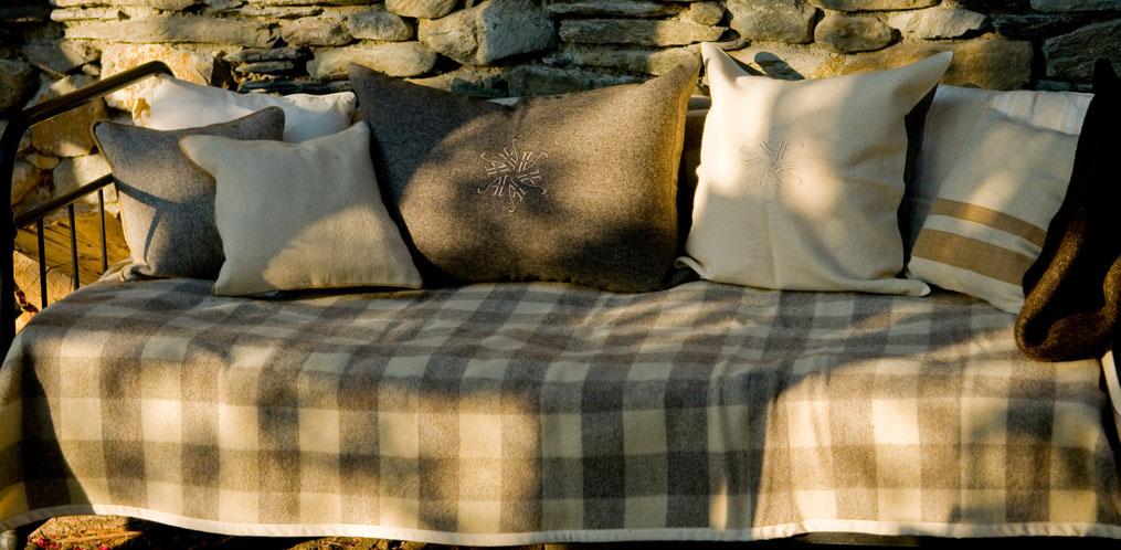 Dans le plus pur « esprit alpin », laines cardées, draps de Bonneval ou de Savoie, Muletière, étoffes de Séez, toiles des Aravis sont ensuite déclinés en plaids, coussins et autres couvre-lits permettant à nos intérieurs d’affronter douillettement et avec élégance les rigueurs de l’hiver. Les heureux possesseurs de chalets trouvant là matière à enrichir leur décor dans le plus pur style montagnard, au luxe ancestral et authentique.
