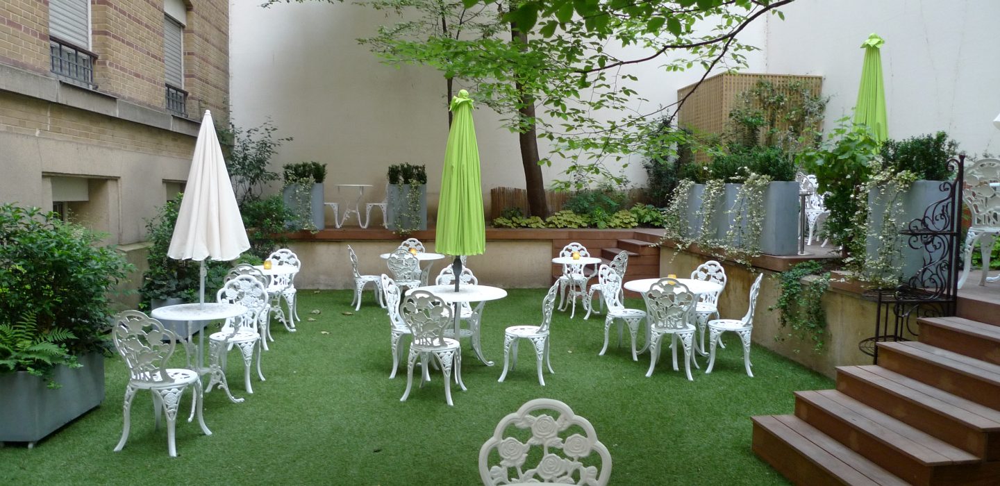 Un patio vert et blanc, en contrebas, avec ses plantes hautes, ses tables immaculées en fonte, qui donne à ce petit bout de 7ème des allures de retraite immobile, sous le soleil, coincé entre jeunes filles en fleur et déjeuner de campagne.