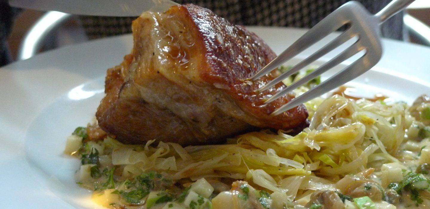 Un cigare de brick à la moelle (plus léger qu’on ne l’aurait imaginé) posé sur un lit de radis crus et cuits comme entrée en matière douce et moelleuse, un beau morceau de poitrine de veau croustillant et tendre à la fois qu’accompagnent comme une heureuse surprise coques, câpres et julienne de poireaux (puissant et parfumé, jouant habilement des contrastes), des frites de pieds de porc langoureusement alanguies auprès d’une purée de panais, comme un uppercut automnal réservé aux amateurs de saveurs à l’ancienne.