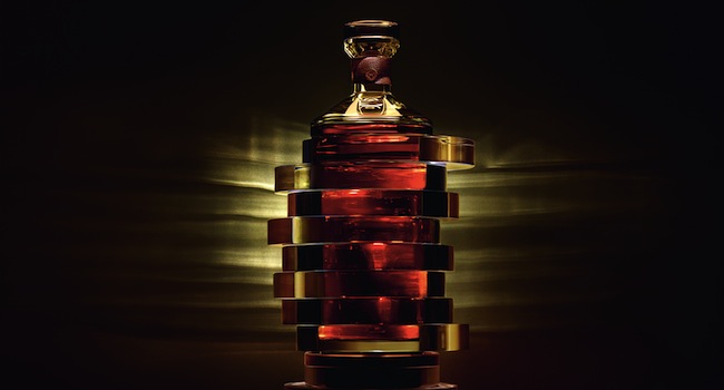 Designé par Arik Levy, le flacon est lui-même un objet exceptionnel, huit anneaux enchâssés en cristal soufflé à la bouche chez Baccarat, un bouchon orné d’un fil de soie de cuivre posé à la main par la Maison Guerlain, le tout placé dans un coffre en bois numéroté, combinant 25 couches de bois de chêne issues de la tonnellerie Hennessy et un lit de cuivre en son coeur.