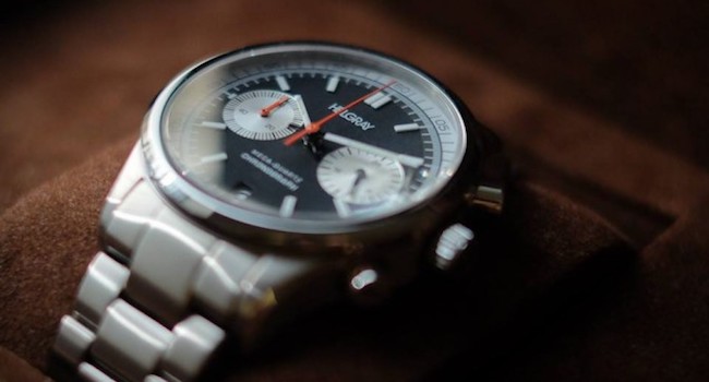 Autre marque à surfer sur la tendance omniprésente des montres vintage : la québécoise Helgray. Lancée en 2014, sa montre inspirée des modèles militaires de la Seconde Guerre mondiale a fait un tabac. Avec ce chronographe tout acier baptisé Silverstone, on change d’ambiance pour se plonger dans l’univers des courses automobile des années 60. De toutes les couleurs de cadran disponibles, le vert offre, à notre sens, le meilleur contraste. Mouvement quartz (Seiko) avec heures, minutes, secondes, date et chronographe. 270 €.