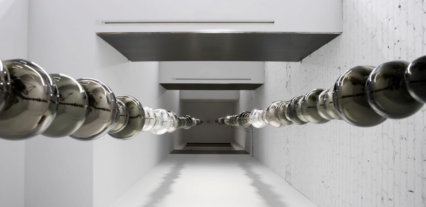 Pour cette exposition intitulée Dark matters, Othoniel a créé des œuvres qui résonnent avec l’espace nouveau et grandiose de la dernière-née des galeries Perrotin. Elles viennent tirer du côté de la poésie, comme Grotte bleue, composée de milliers de briques de verre fixées sur une superstructure invisible.