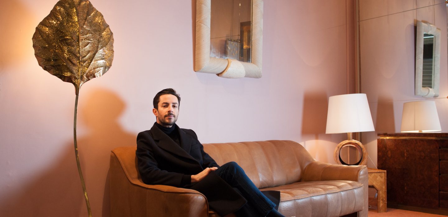 Lors de notre dernière visite, on pouvait ainsi trouver chez lui dans une scénographie très étudiée une très belle table basse de Paul Mc Cobb, designer américain des années 50, un lampadaire en laiton en forme de feuille de rhubarbe de Tommaso Barbi, créateur italien des années 70, à la frontière du kitsch mais très décoratif, un canapé en cuir de Sede modèle DS 44 des années 80 et des suspensions en verre de Murano.