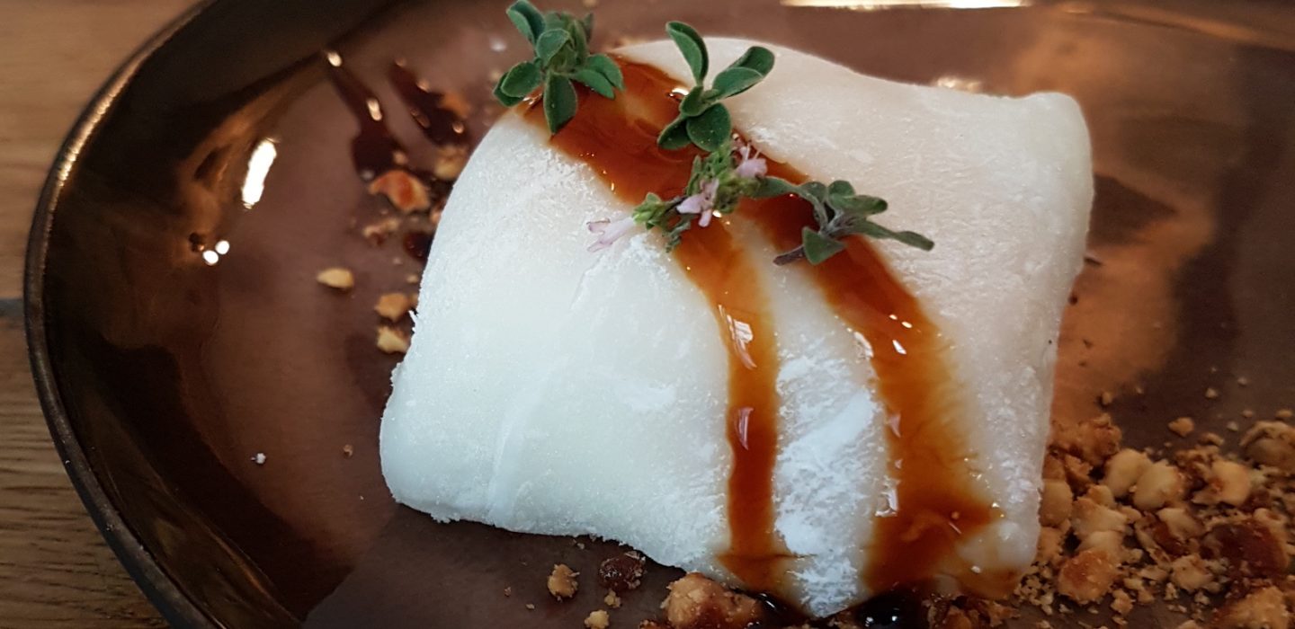 Puis vient le “Magret de canard, épinards et pesto à la sarriette” dans sa belle composition en demie-lune. Cuisson impeccable du canard luisant sous sa peau caramélisée, bien à l’abri sous son toit d’épinards d’un vert claquant et fermes sous la dent. Un pesto épais ajoute une pointe poivrée à l’équilibre parfait du plat.