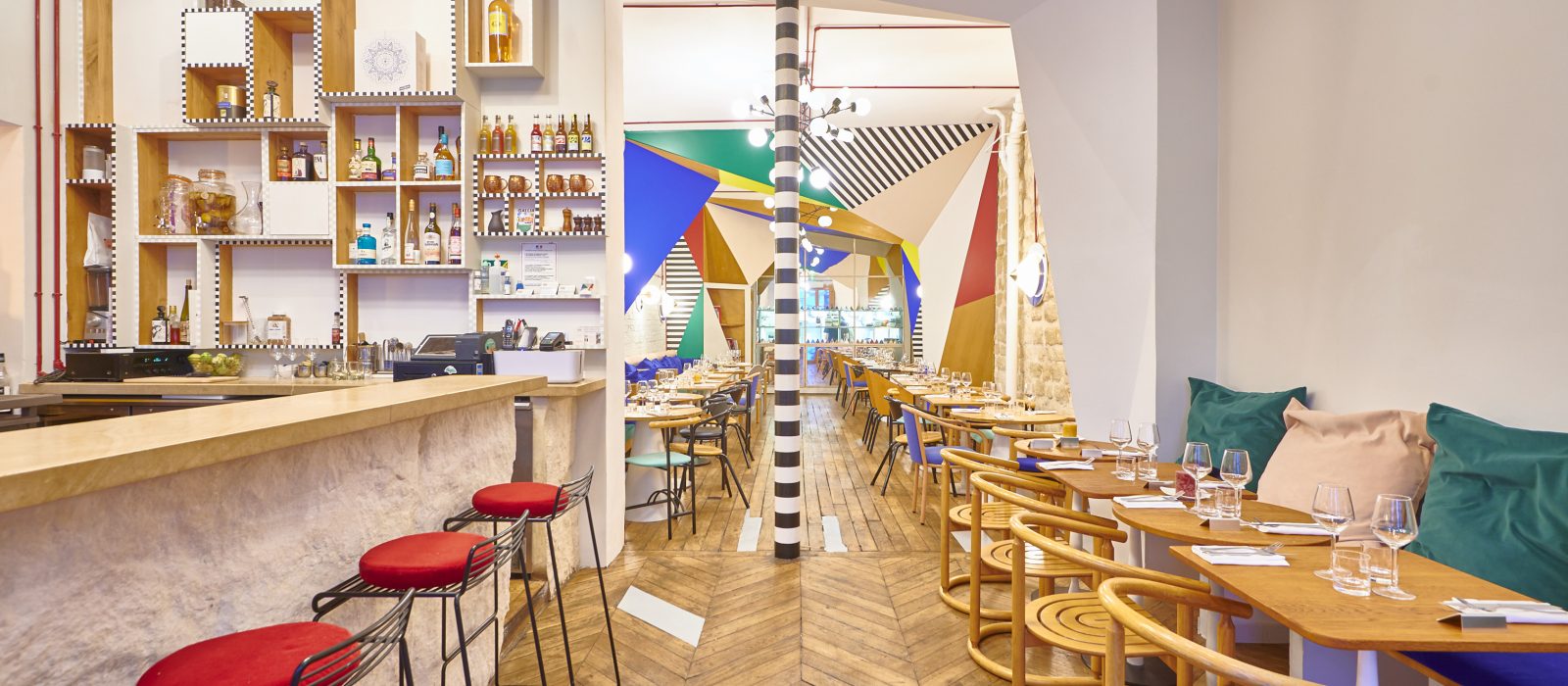 Aplats colorés, rayures version XXL et motifs géométriques, chez Mâche, la grisaille parisienne n’a pas droit de cité ! Fruit de l’imagination débordante du designer Charles du Pouget, l’esthétique fantaisiste de cette nouvelle table du quartier Poissonnière est un croisement joyeux de pop art et d’Art Déco. Les chaises offrent à elles seules un bel éventail de la crème du design des 80s : Philippe Starck pour Driade, Rodney Kinsman pour Padova… Murs grattés et parquet ancien viennent compléter le tableau, sans compter la cuisine vitrée, dans laquelle on aperçoit le chef Michaël Gamet et sa team s’activer.