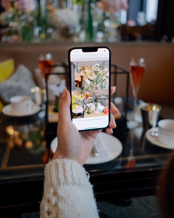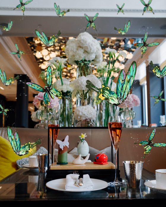 On joue avec des papillons virtuels, dont certains abritent des cadeaux comme du champagne Ruinart ou une nuit à l’hôtel. Les collectionneurs peuvent activer un QR code pour espérer décrocher une œuvre d’art en format NFT (non-fongible token). Une fois n’est pas coutume, il est fortement recommandé de garder son téléphone à table.