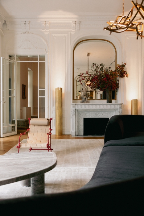 Parmi les pièces phares, le canapé monumental Sara, long de six mètres, trône au milieu du salon. On trouve aussi une table basse en noyer, deux tables en laque patinée conçues avec Pierre Bonnefille, ainsi que des appliques sculptées en bronze et plâtre, et deux miroirs en laiton imaginés en hommage à Scarpa. Sur les murs, la sélection de peintures du XIXe siècle et des photographies contemporaines choisies par le commissaire Paul Calligaro complètent ce lieu magique follement parisien.