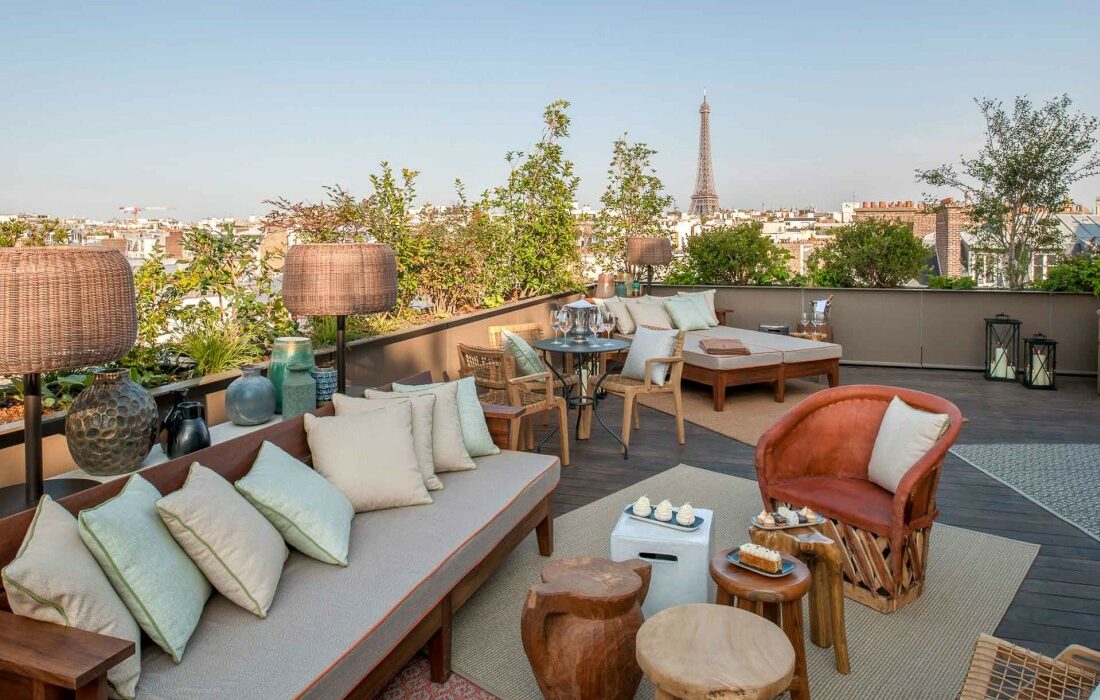 Dès l’entrée, le ton est donné avec une mise en scène plébiscitant le verre et le cuir, le métal et les essences de bois. Dans les 59 chambres et suites de cet hôtel de luxe de Paris, toutes différentes, objets insolites, livres, œuvres d’art, matières brutes et raffinées façonnent une ambiance d’appartement des années 30 savamment désordonnée. Le must ? Les suites (de 60 à 200 m²) avec terrasses généreusement végétalisées, qui cachent souvent un jacuzzi ou un bain norvégien et une vue sur la Tour Eiffel.