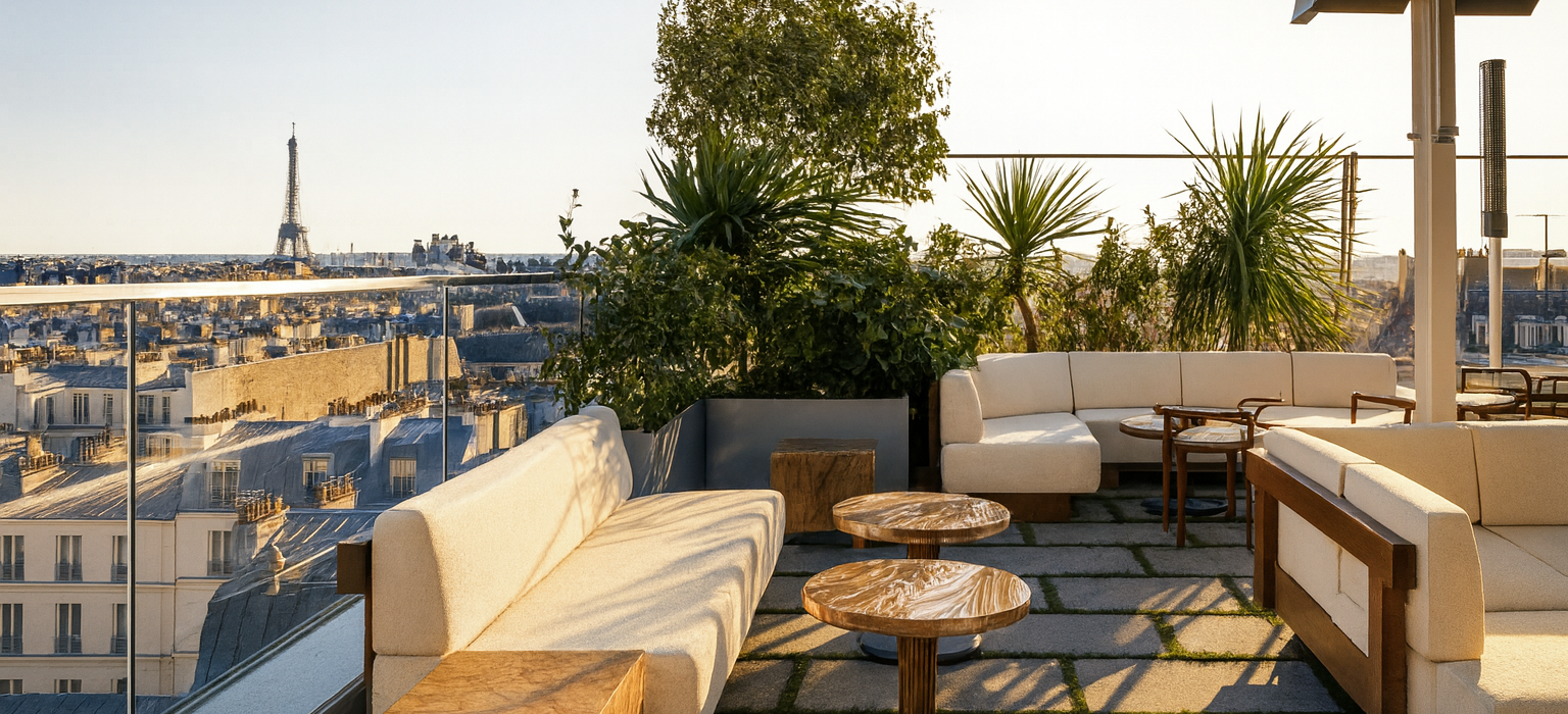Le rooftop à Paris attire un public plus nocturne, curieux de cette vision de la capitale hors clichés, entre l’Arc de Triomphe au loin et les flux du boulevard urbain en contrebas. Le volet bien-être, rarement aussi ambitieux en contexte intra-muros, articule une piscine semi-olympique aux lignes minérales, un spa expert, un sauna, une salle de sport conçue comme un studio premium et même un mur d’escalade intérieur. Une partie du bâtiment accueille également des espaces de travail flexibles, un auditorium et des salons pour projets créatifs, renforçant l’idée qu’un hôtel ne se limite plus à dormir, mais à penser, produire, échanger, respirer autrement.