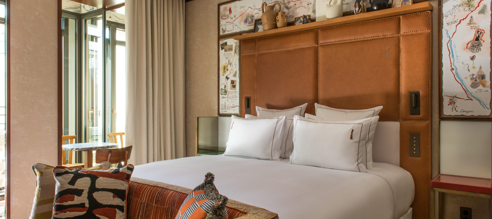 Les 53 chambres (de 25 à 40 m²) et 4 suites (de 53 à 73 m², pour certaines avec terrasse), traduisent son approche intime du design. Croquis esquissés sur les murs, objets sentimentaux, boiseries en jatoba, cuir à surpiqûres épaisses : chaque détail semble avoir été choisi pour sa capacité à raconter quelque chose.