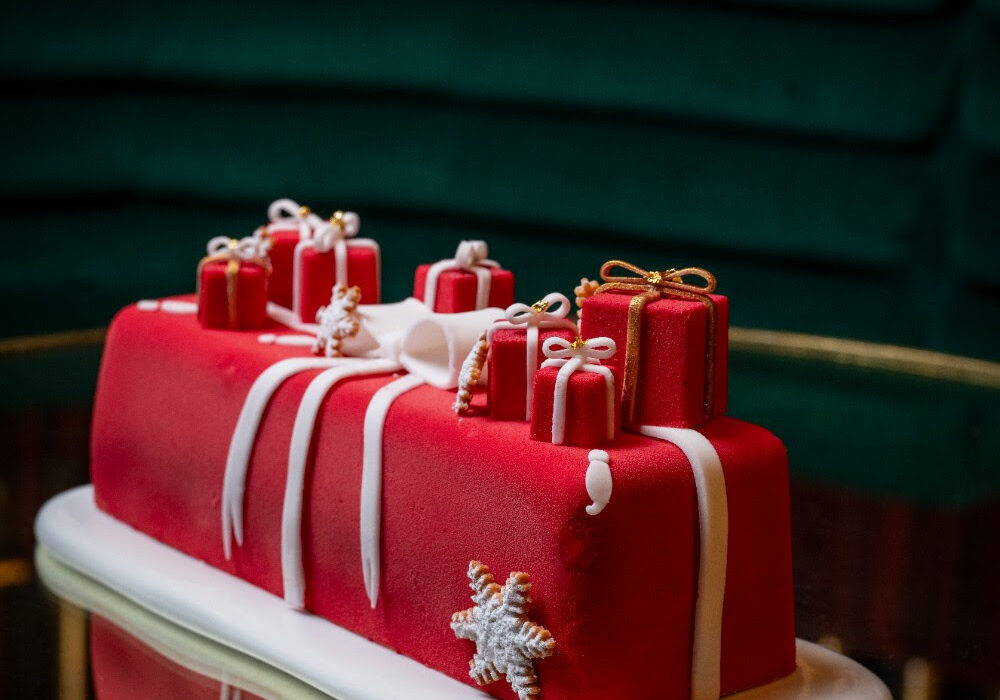 Créée en collaboration avec la maison Christofle, cette bûche de Noël version 2025, véritable maquette de l’hôtel est une prouesse technique. Derrière les deux sapins de la façade en chocolat blanc on trouve une mousse vanille de Madagascar, un croustillant praliné amande et spéculoos, une compotée de pommes, et un biscuit moelleux.
