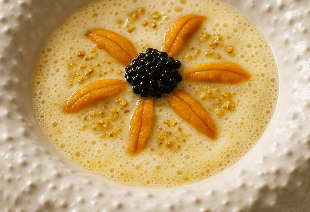Cette recette créative s’inscrit dans une cuisine d’auteur maîtrisée, attentive aux produits et à leur expression naturelle, où chaque élément trouve sa place sans jamais saturer l’assiette. « La royale capture l’essence iodée de l’oursin et la douceur des Saint-Jacques », explique le chef, évoquant un équilibre recherché entre intensité marine et précision technique. À l’image de son restaurant gastronomique et de son territoire, Ilane Tinchant défend une gastronomie lisible, exigeante, profondément ancrée dans son paysage.