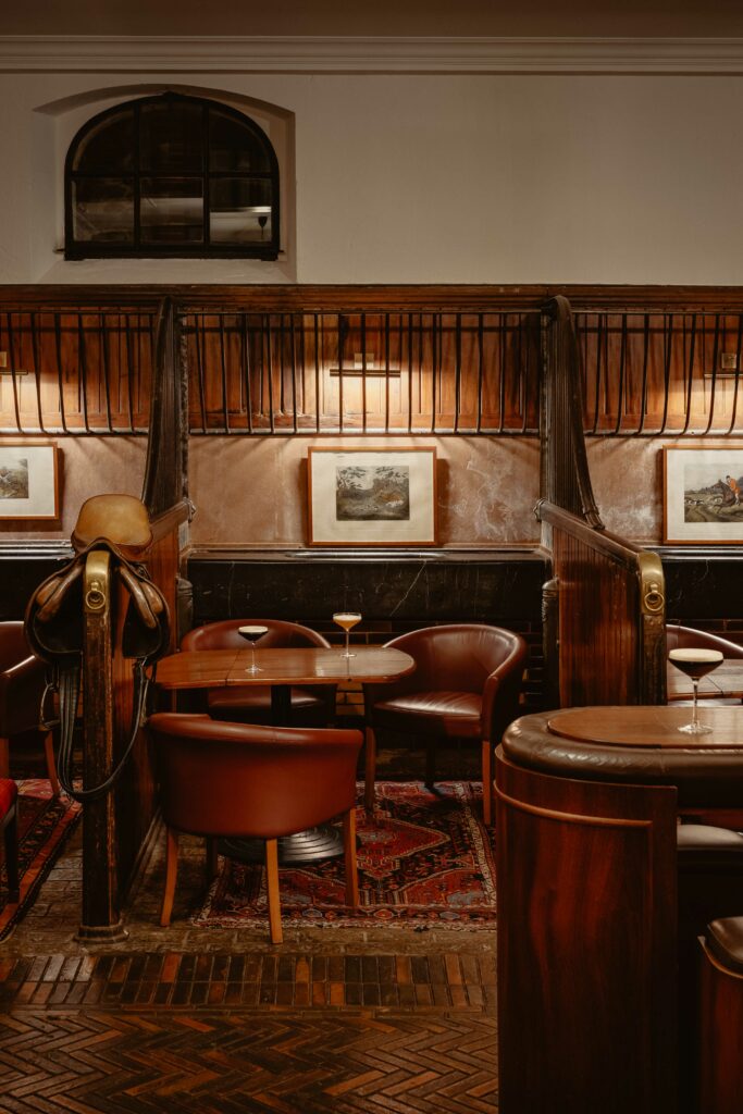 Un peu plus tard, les amoureux se retrouvent au Bar des Écuries, sans doute l’adresse la plus singulière du domaine. Les boxes de chevaux (bois sombre, montants de laiton, dalles pavées, mangeoires intactes) ont été métamorphosés en alcôves feutrées. On s’y installe comme dans une loge privée pour feuilleter une carte riche de plus de 40 whiskies, une dizaine de cocktails maison (dont un « Signature Bretesche » à base de pomme, calvados et romarin brûlé), une collection de digestifs rares et une gamme de boissons chaudes servies dans de la porcelaine blanche comme un clin d’œil à l’élégance sportive anglaise. Cuirs patinés, tapis épais, tableaux de chasse, lumière tamisée : l’atmosphère romantique du lieu est celle où l’on débute la soirée, ou bien où l’on prolonge la conversation autour d’un dernier verre.