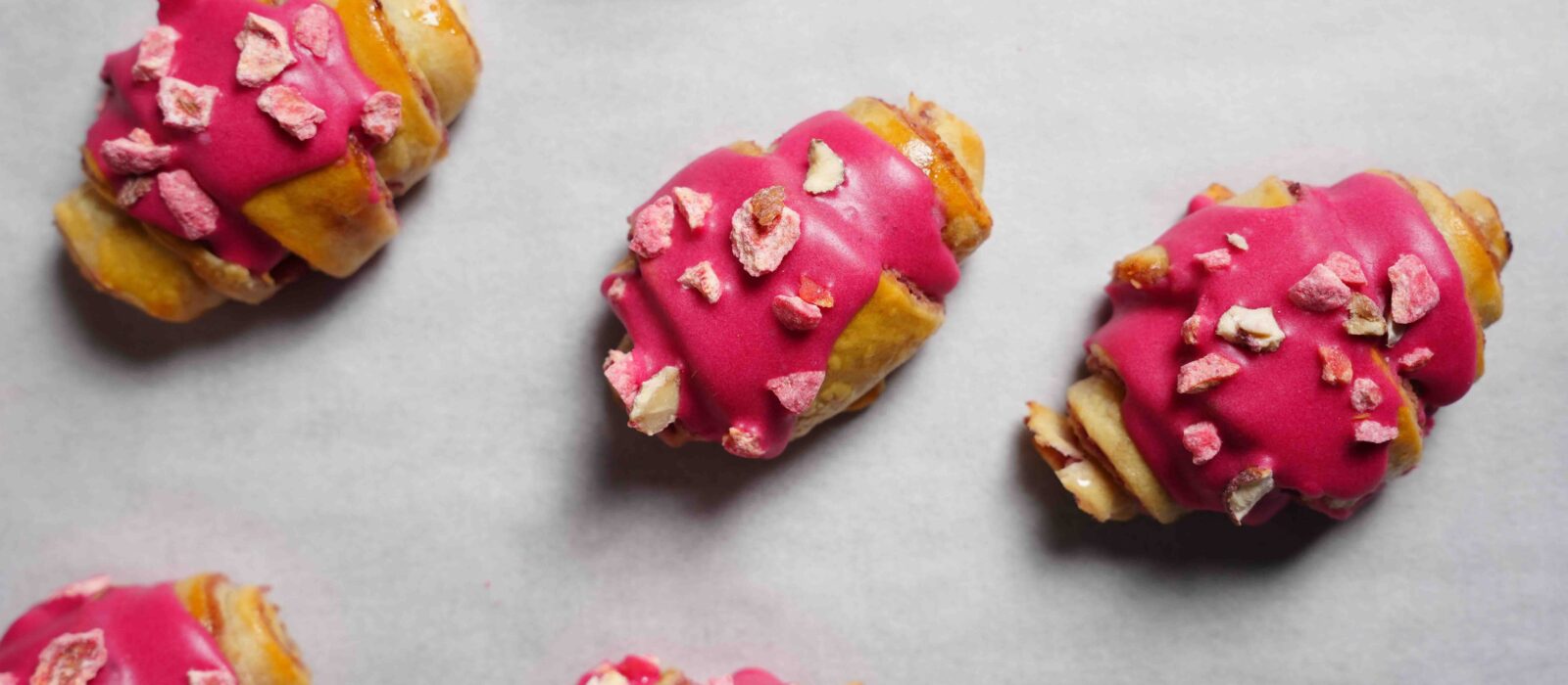 Vous ne connaissez pas les Rugelach de Babka Zana ? Quelle hérésie ! Ces mini-croissants feuilletés garnis sont d’ordinaires fourrés au chocolat & à la cannelle ou encore à la noix de pécan et au sirop d’érable. Mais pour la Saint-Valentin, fraîcheur et régression sont de mise. Crème d’amande, framboise et praline rose. Un petit plaisir à partager sans culpabiliser.