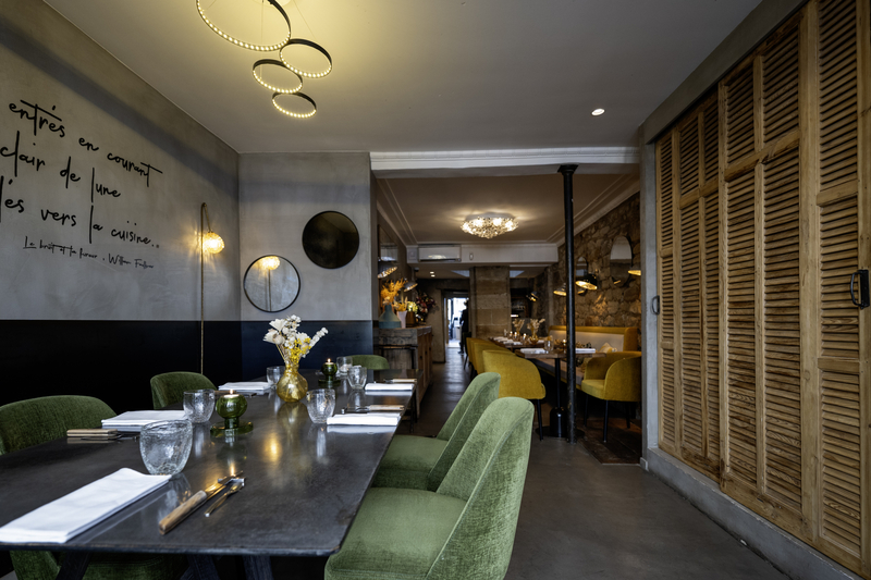 On conclut en douceur avec une mousse chocolat et menthe sauvage, crumble charbon de bambou et noisette, gel de cassis. Et un duo de mignardises : cookie tiède au chocolat, bonbon passion-framboise. Une citation de William Faulkner orne un mur : « Nous sommes entrés en courant dans le clair de lune et sommes allés vers la cuisine ».